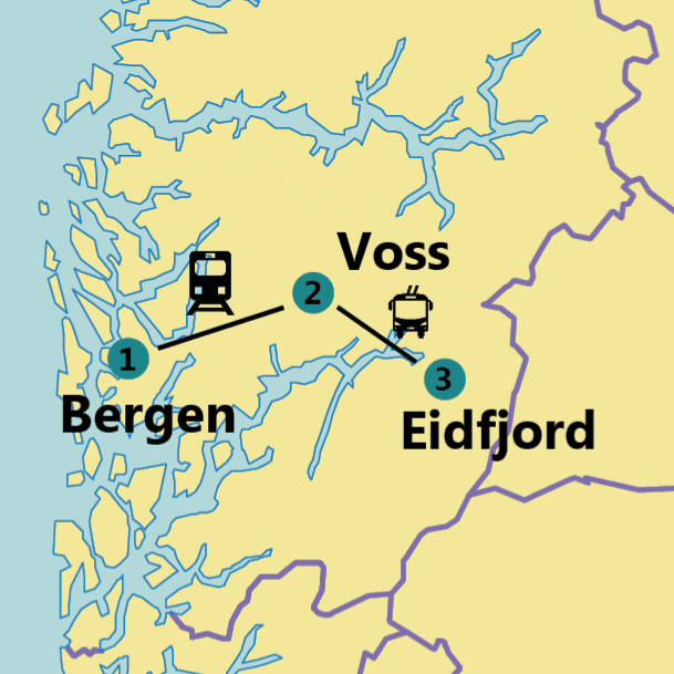 Frå Bergen tar du tog til Voss og deretter buss til Eidfjord.